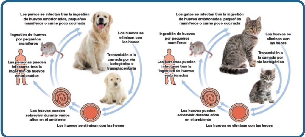 Los animales adultos se infectan por comer animales del medio ambiente o por entrar en contacto con las heces de otros animales infectados. Tienen forma de gusanos redondos.
