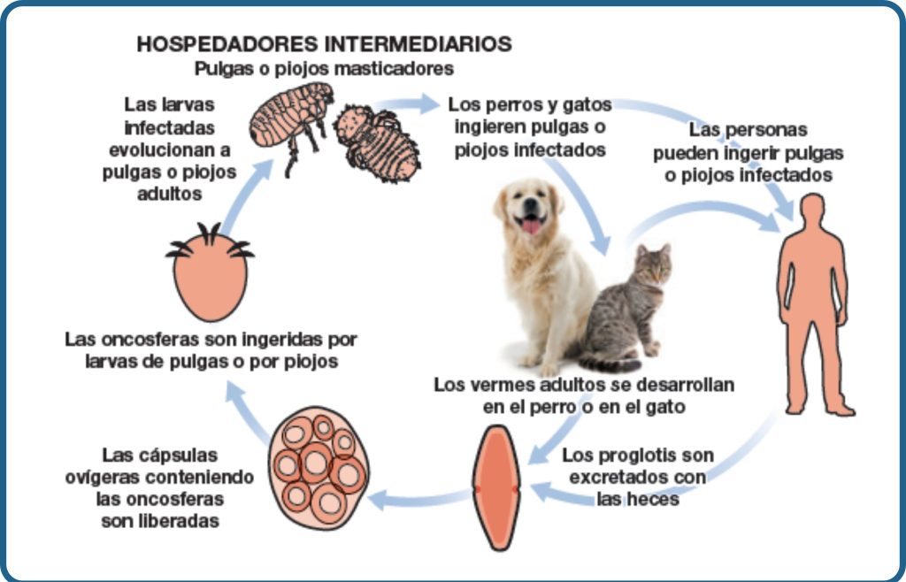 - Dipylidium caninum: estos parásitos expulsan sus huevos del animal, y estos huevos pueden moverse por sí mismos. Es un parásito en el que las pulgas y piojos intervienen en el ciclo vital del parásito. El perro o gato al rascarse o lamerse ingieren la pulga o piojo puede ingerirse por el perro o el gato cuando se rasca con los dientes o en el lamido y desarrollarse entonces dentro del animal y contagiar esta enfermedad tan importante. Los huevos al moverse causan irritación y picor de la zona anal del animal produciendo que arrastre la zona trasera por el suelo.