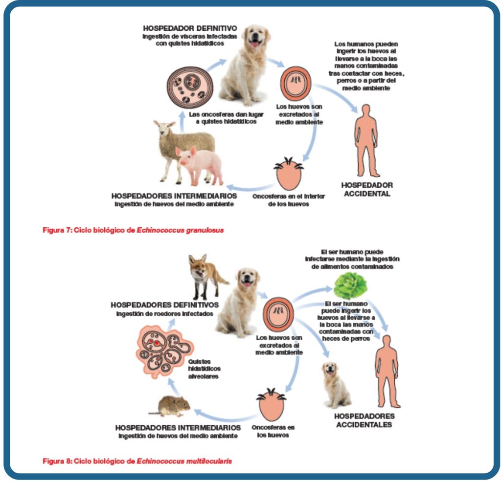 - Echinococcus spp.: son las TENIAS y es un parásito MUY importante porque puede causar una grave enfermedad en los seres humanos llamada hidatidosis (es una zoonosis). Su importancia es tan grande que su prevención es un requisito INDISPENSABLE en animales que van a viajar a otros países.