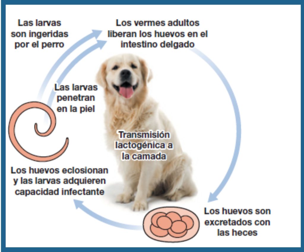 - Gusanos gancho como Ancylostoma spp: tienen un sistema de enganche en la boca que hace que pueda alimentarse de sangre en la mucosa intestinal, causando anemia grave en aquellos casos en los que haya mucha carga parasitaria o que el animal tenga parásitos durante mucho tiempo. Los A. vasorum por ejemplo son causantes bronquitis dado que durante su ciclo vital “pasan” por los pulmones y producen irritación local, además de problemas de coagulación, problemas intestinales e incluso llegan a causar intolerancia al ejercicio por la afectación del sistema respiratorio.